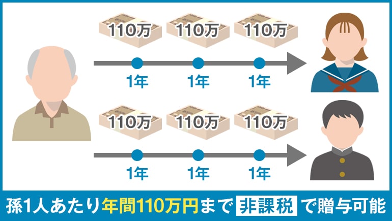遺言状の作成や養子縁組による相続以外にも、贈与者が生きているうちに孫に財産を継がせる方法があります。